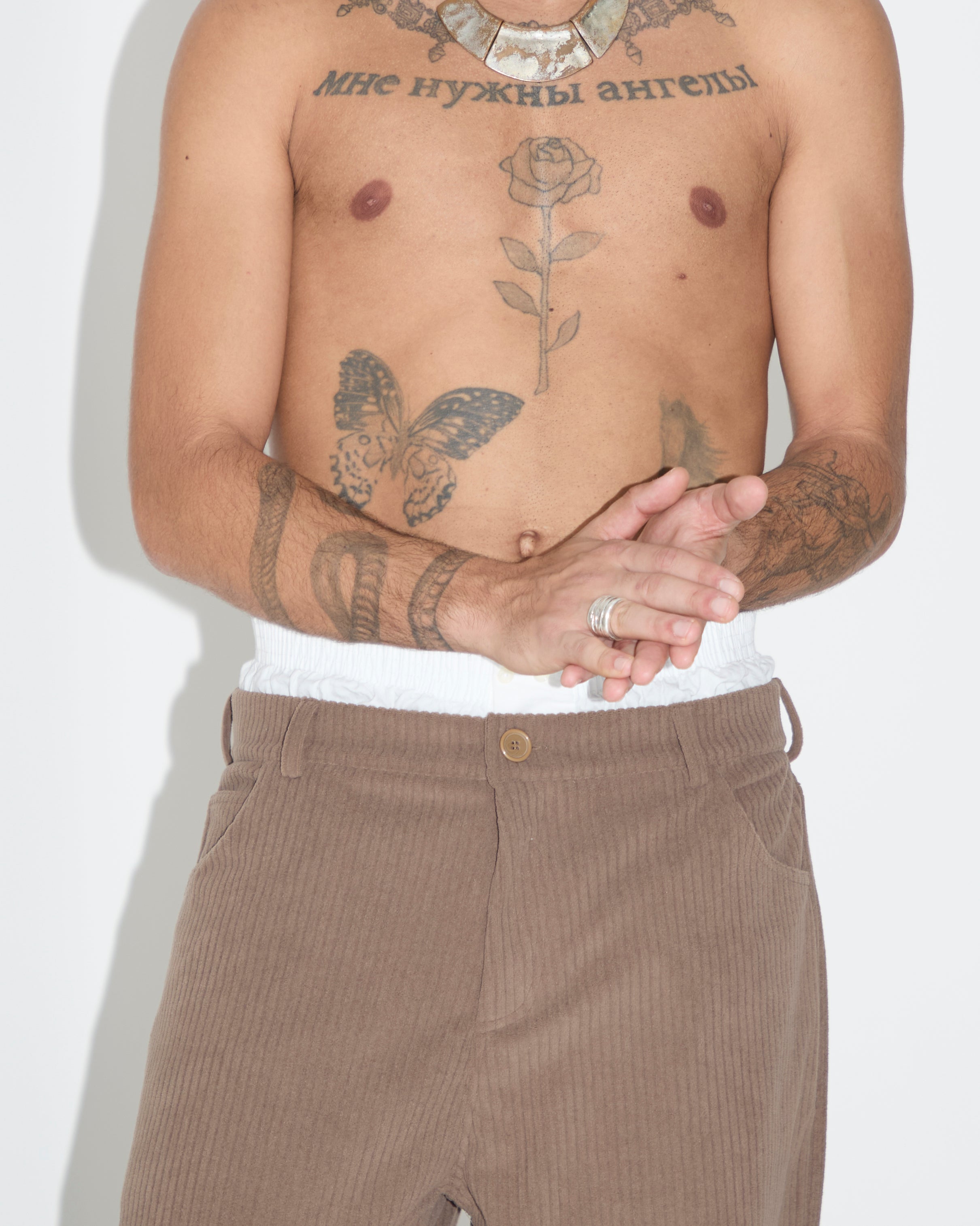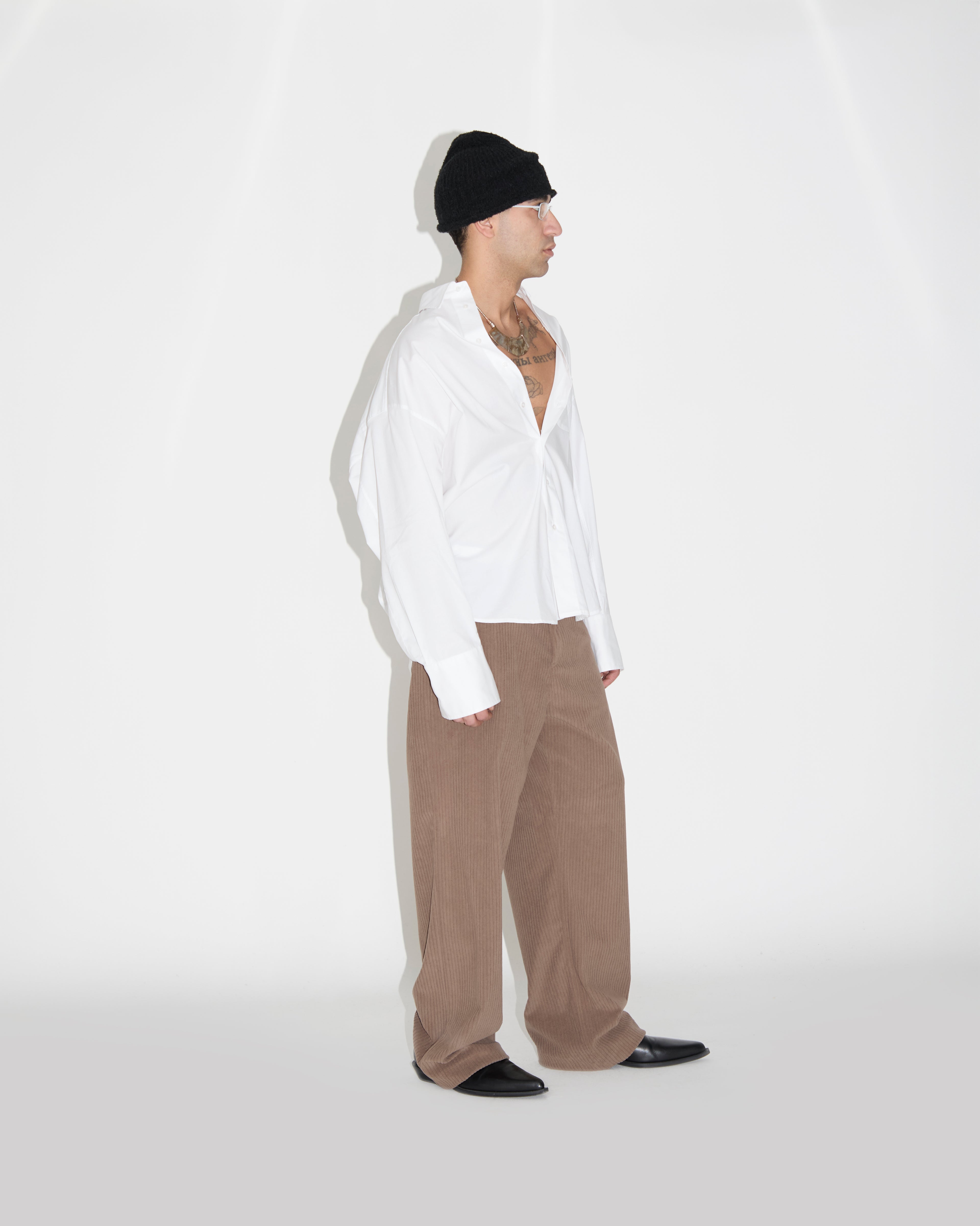 -Il nostro pantalone ha come caratteristica identificativa la parte posteriore del fondo che viene stondata risultando più corta della parte parte anteriore