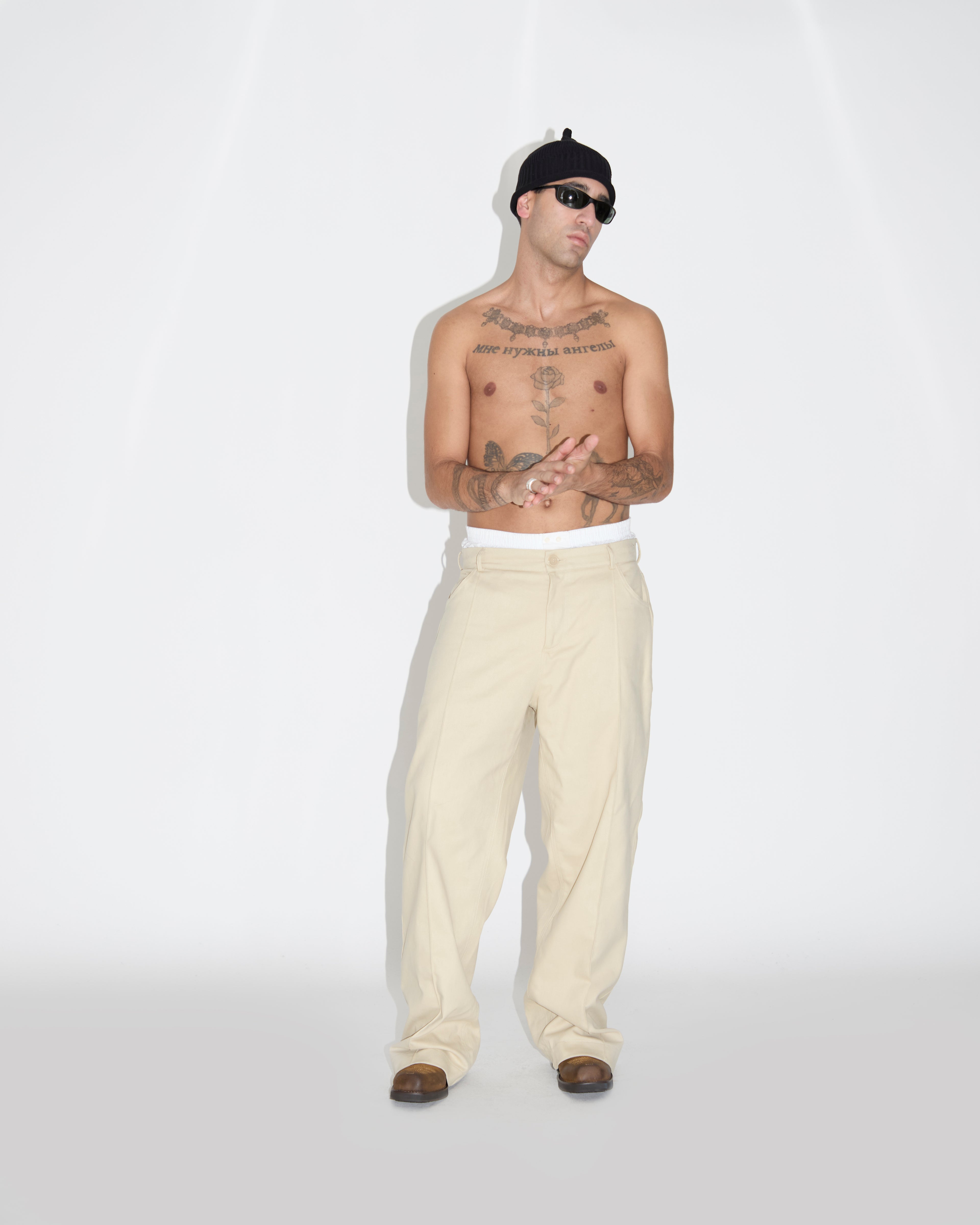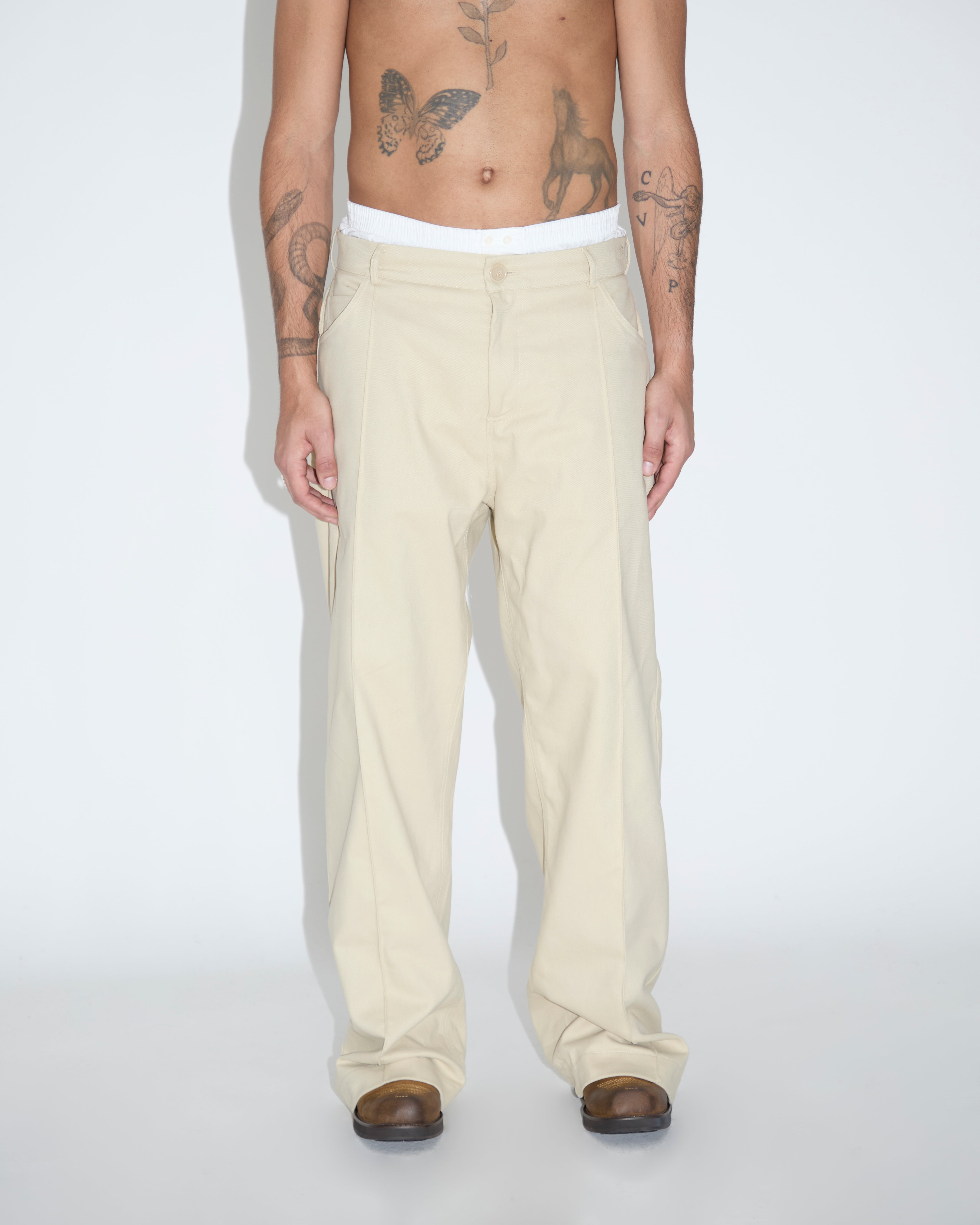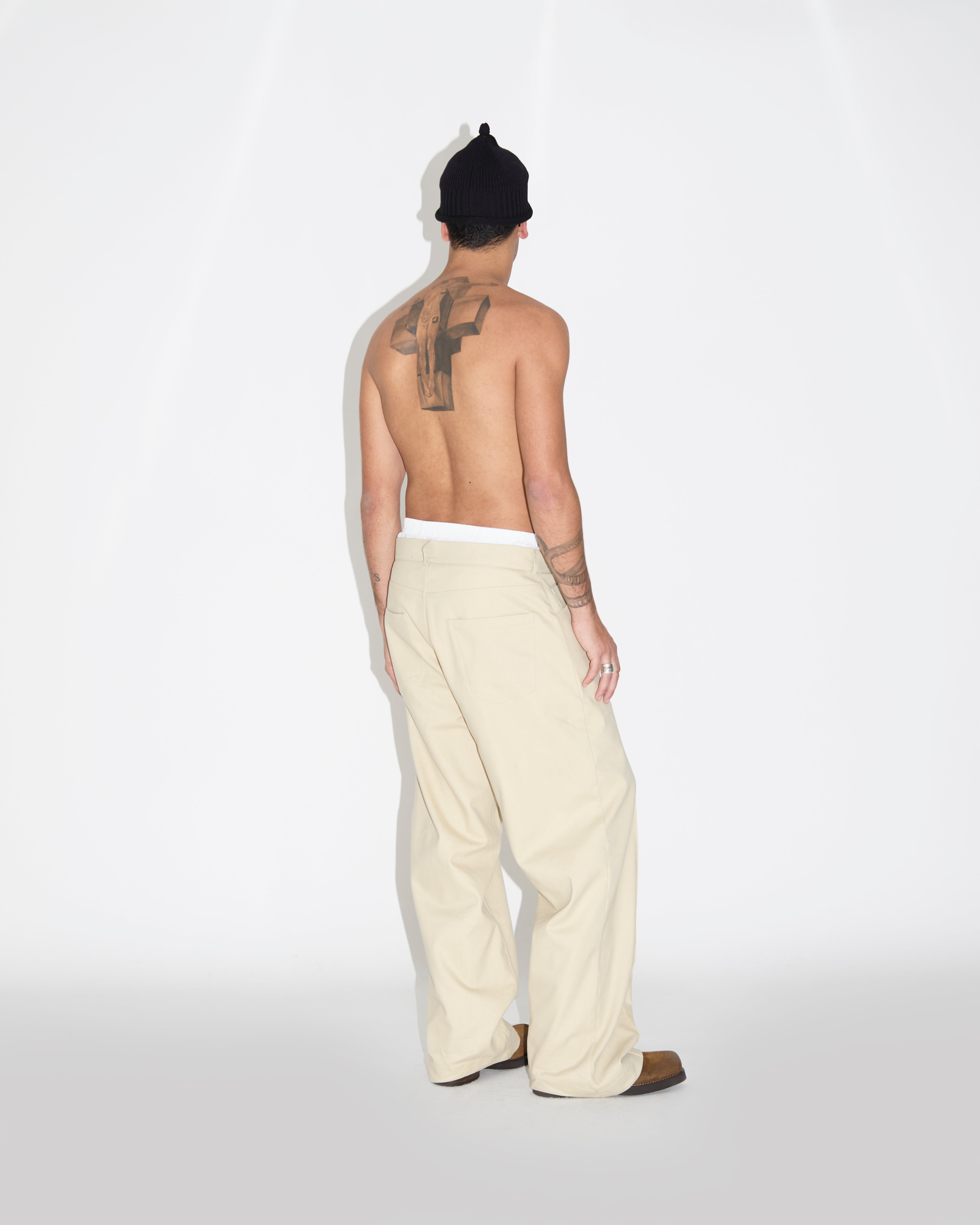 -Il nostro pantalone ha come caratteristica identificativa la parte posteriore del fondo che viene stondata risultando più corta della parte parte anteriore