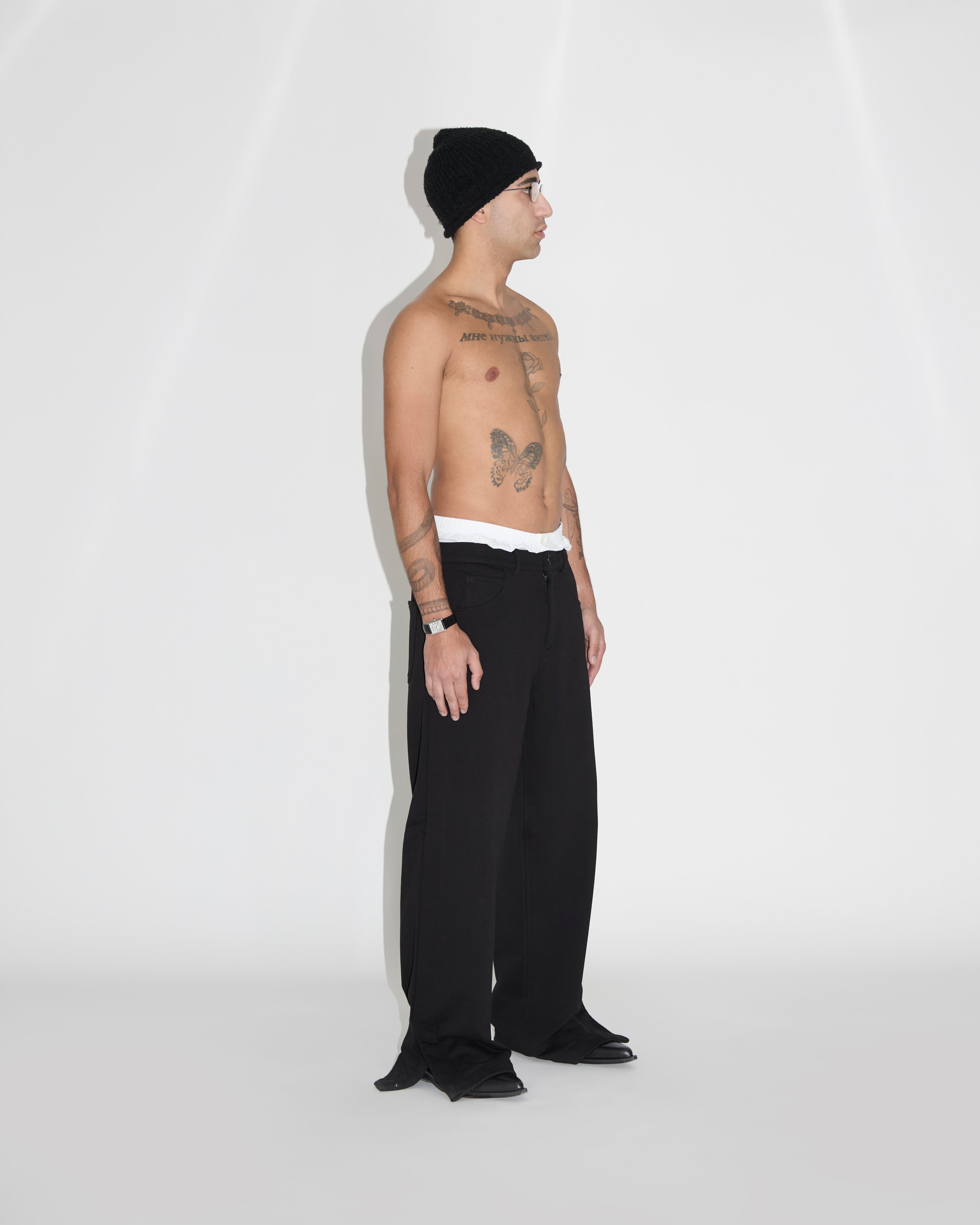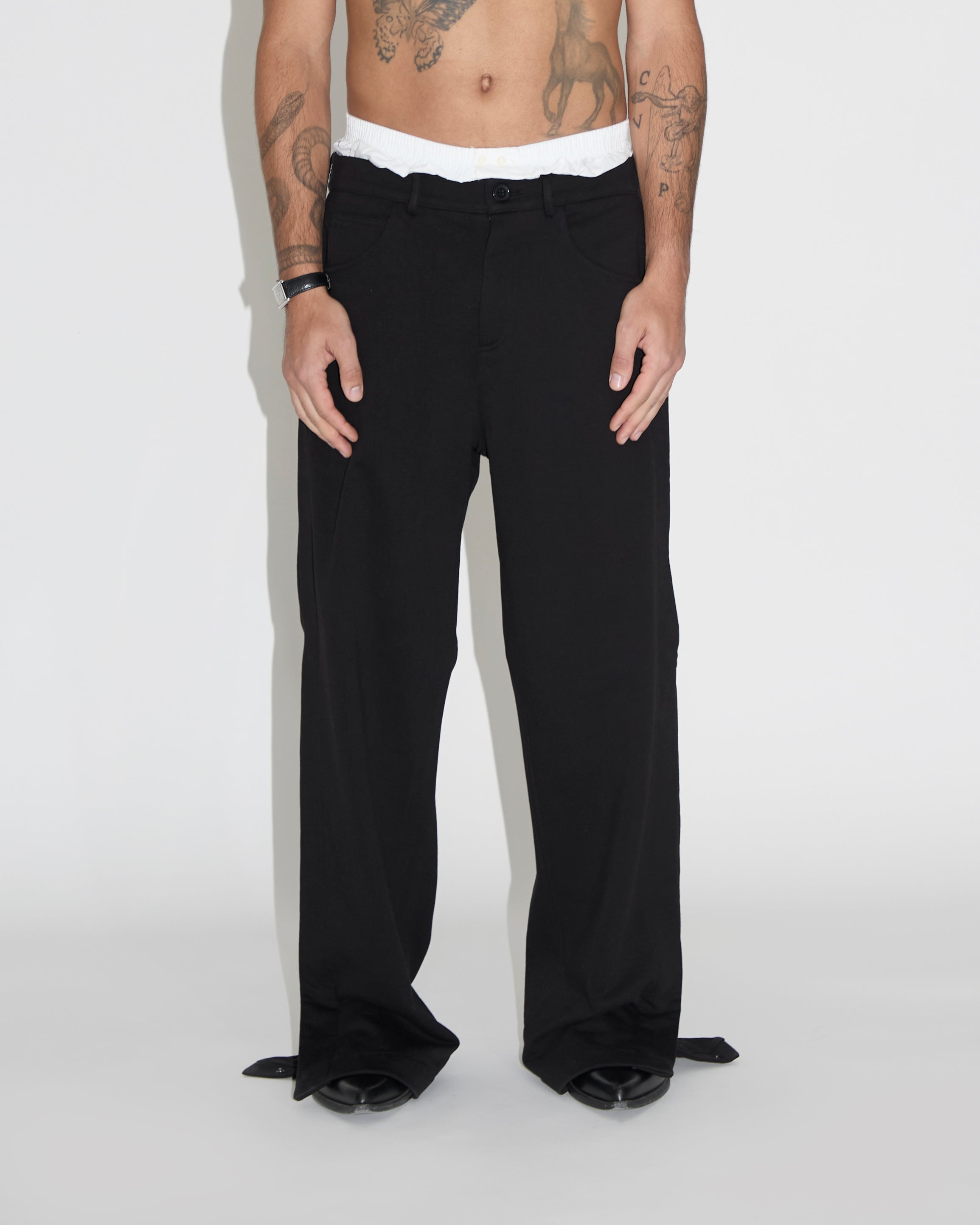 -Il nostro pantalone ha come caratteristica identificativa la parte posteriore del fondo che viene stondata risultando più corta della parte parte anteriore.